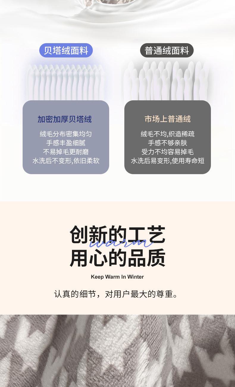 規(guī) 格:被套-200×230(±2)cm 床單-230×245(±2)cm 枕套-48×74(±1)cm×2 面 料:加密加厚貝塔絨 花 型:干鳥格灰 二代貝塔超柔保暖面料,手感細(xì)膩,雙面親膚,冬日必選品。 創(chuàng)新的工藝,用心的品質(zhì),認(rèn)真的細(xì)節(jié),對用戶的尊重。 無印新風(fēng)尚設(shè)計(jì),創(chuàng)新,讓生活更精彩