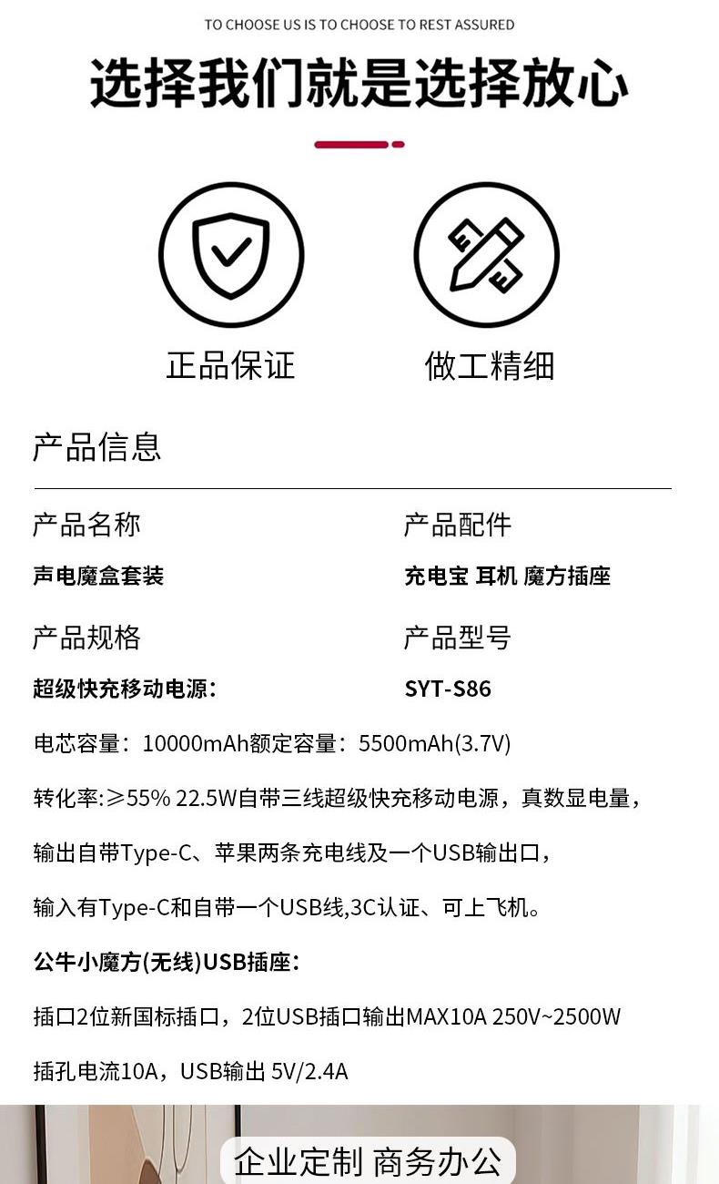 公牛小魔方(無線)USB插座+勝源通超級(jí)快充移動(dòng)電源 產(chǎn)品重量:620g 超級(jí)快充移動(dòng)電源:電芯容量10000mAh自帶三線3C認(rèn)證 公牛小魔方(無線)USB插座: 插口2位新國標(biāo)插口,2位USB插口 立體集成結(jié)構(gòu)、小巧便攜、自動(dòng)分流、微動(dòng)開關(guān)、五重保護(hù)