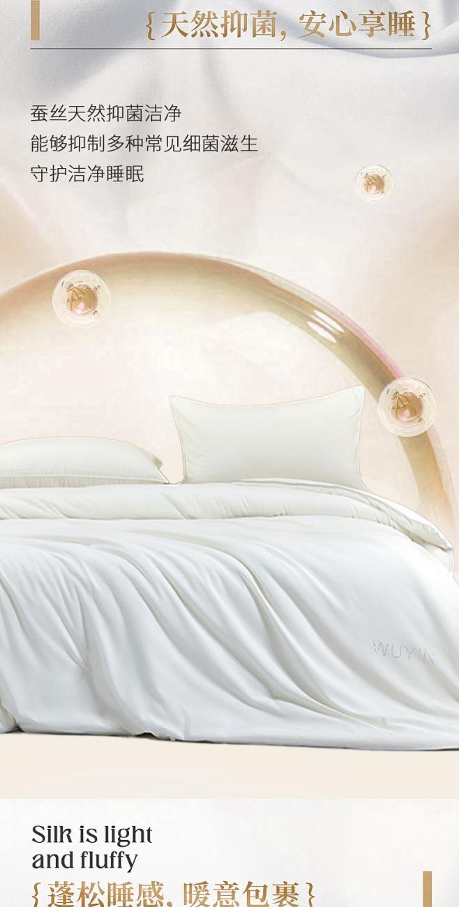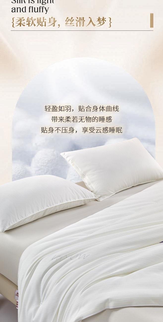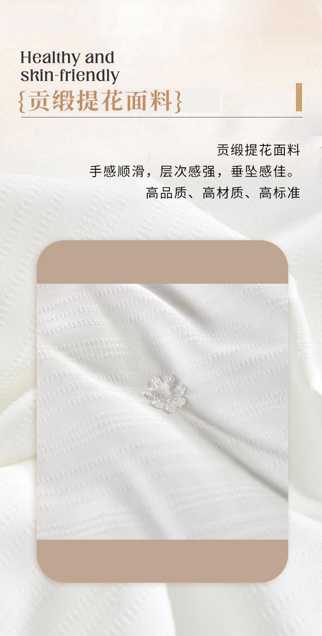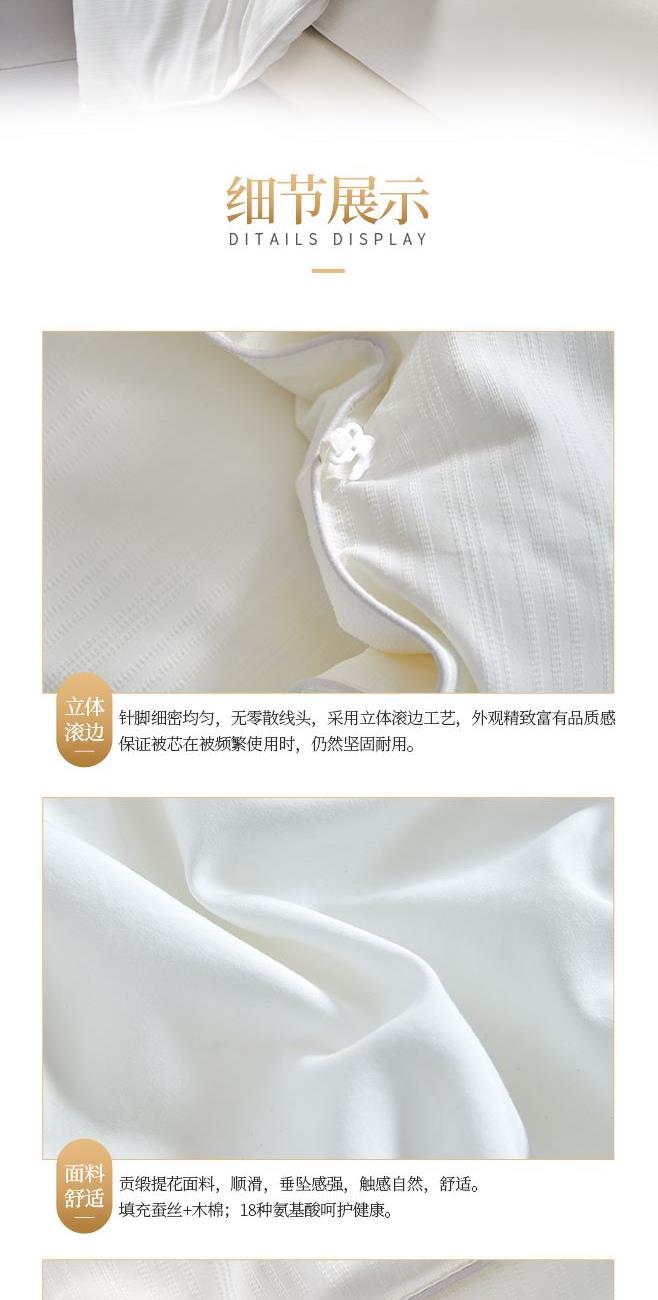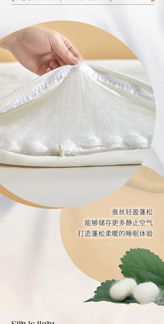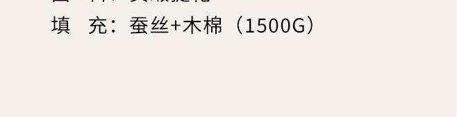 規(guī) 格:200×230(±2)cm 克 重:2700g 面 料:貢緞提花 填 充:蠶絲+木棉(1500g) 填充含蠶絲,18種氨基酸,有效的呵護我們睡眠和健康。 貢緞提花面料,手感順滑,層次感強,垂墜感佳。 寬邊設計,細節(jié)處理,被子更大氣。 高品質(zhì)、高材質(zhì)、高標準,一款對生活高度負責的產(chǎn)品