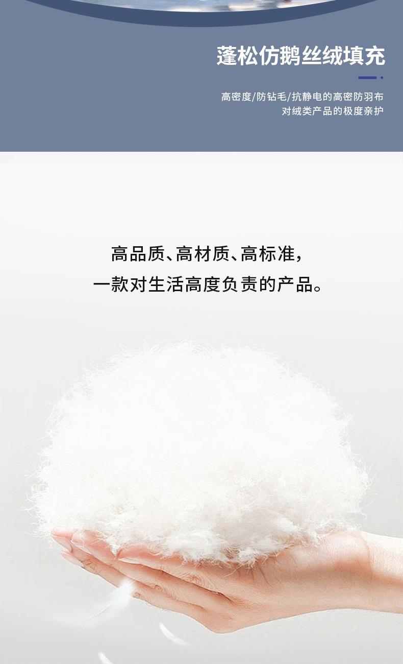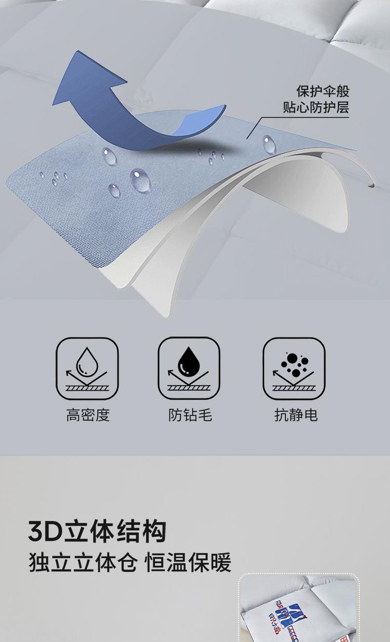 規(guī) 格:200×230(±2)cm 克 重:2600g 面 料:錦絨防羽布 填 充:優(yōu)質(zhì)混紡鵝絲(1500g) 高密度/防鉆毛/抗靜電的高密錦絨防羽布,對絨類產(chǎn)品的極度親護。 蓬松仿鵝絲絨填充,科學配比,聚暖保溫,自然健康。 高品質(zhì)、高材質(zhì)、高標準,一款對生活高度負責的產(chǎn)品