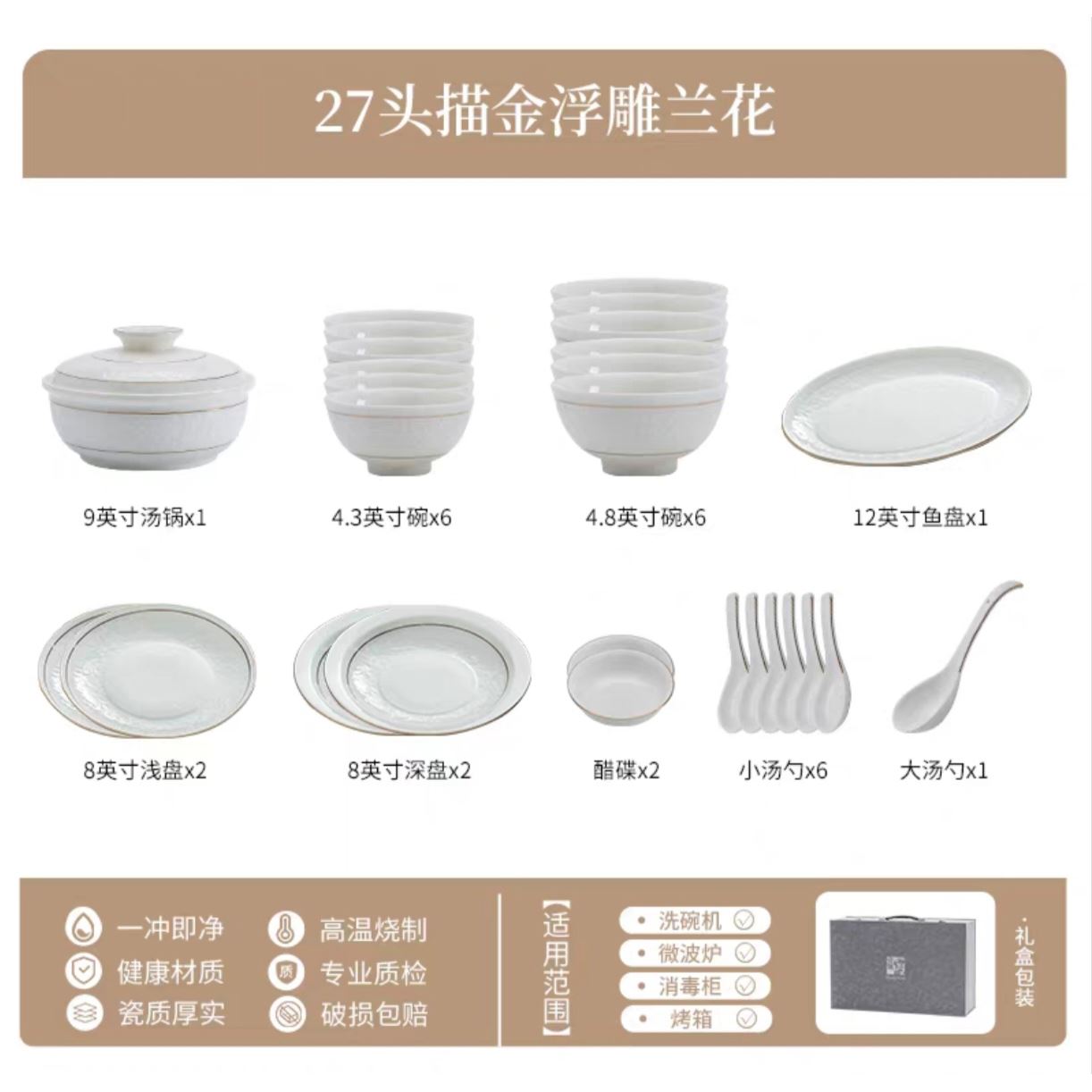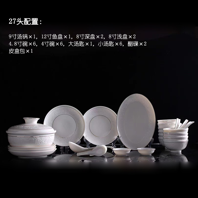 27頭配置: 9寸湯鍋×1, 12寸魚(yú)盤(pán)×1, 8寸深盤(pán)×2, 8寸淺盤(pán)×2, 4.8寸碗×6, 4寸碗×6, 大湯匙×1, 小湯匙×6, 醋碟×2, 皮盒包×1。