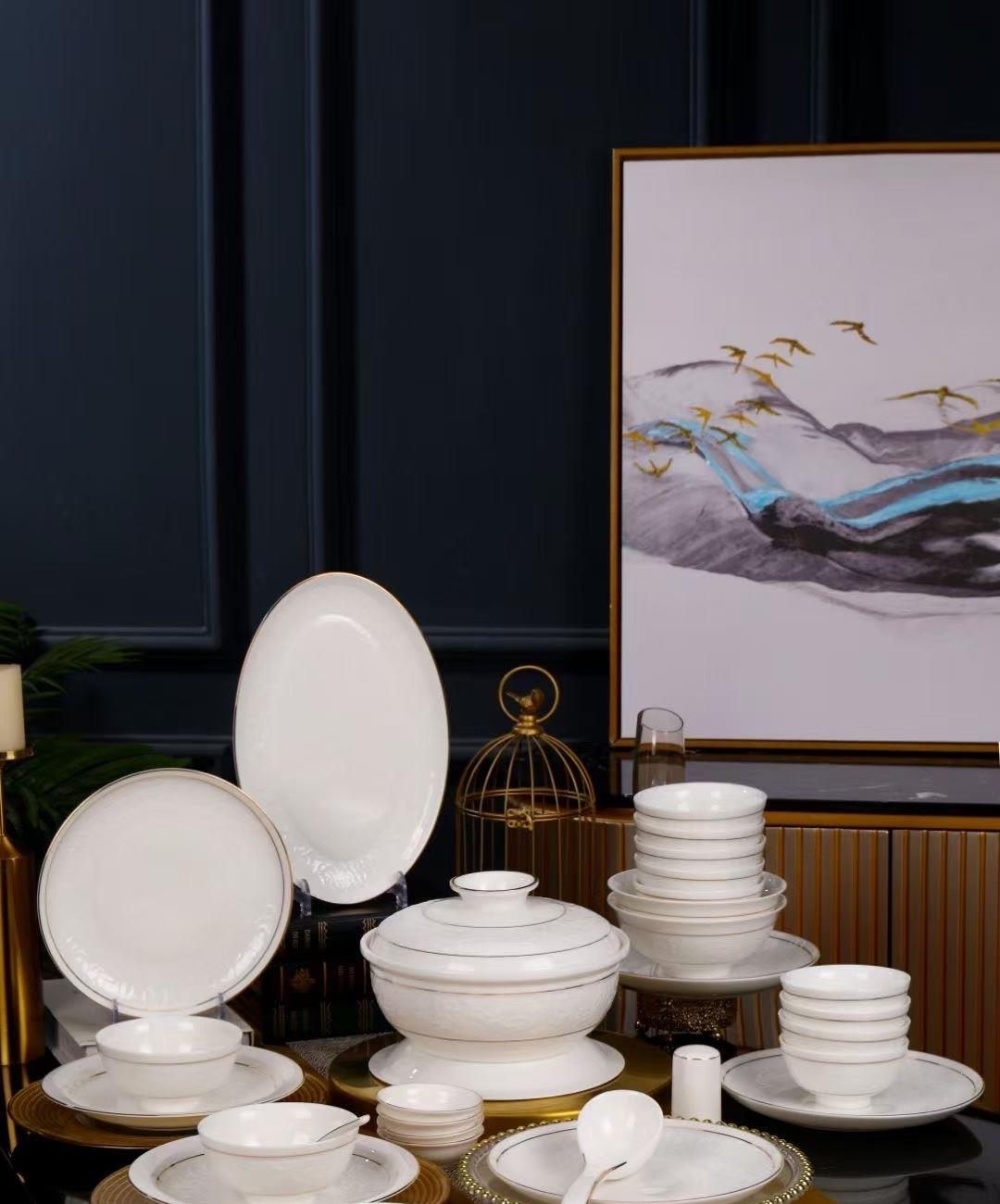 尾橋下窯羊脂玉瓷浮雕玉蘭27頭餐具套裝白瓷描金年會(huì)節(jié)日伴手禮