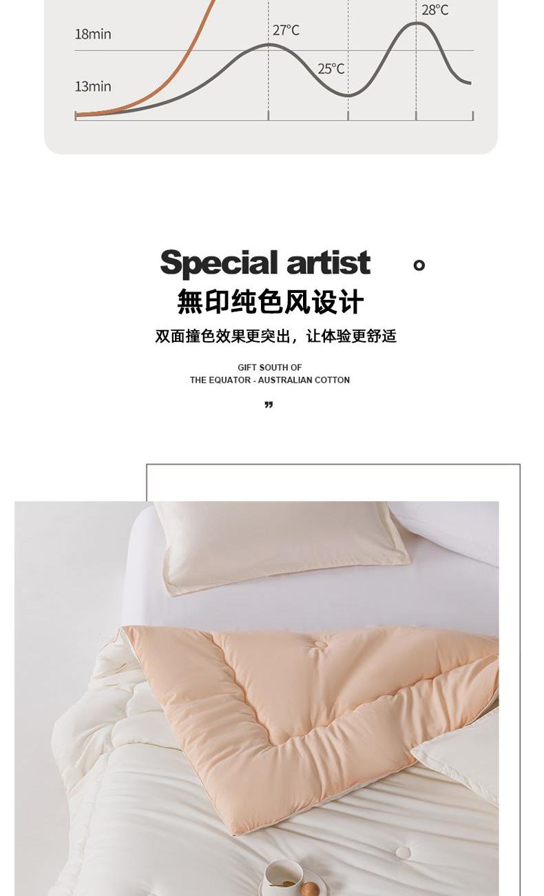 規(guī) 格:200×230(±2)cm 2500g 面 料:水洗棉 填 充:牛奶纖維(1500g) 細(xì)膩、柔軟的面料,冬日的杯奶茶的溫暖。 有機(jī)、健康的牛奶絲填充,冬日更貼心的絲滑呵護(hù)。 無(wú)印純色風(fēng)設(shè)計(jì),雙面撞色效果更突出,讓體驗(yàn)更舒適