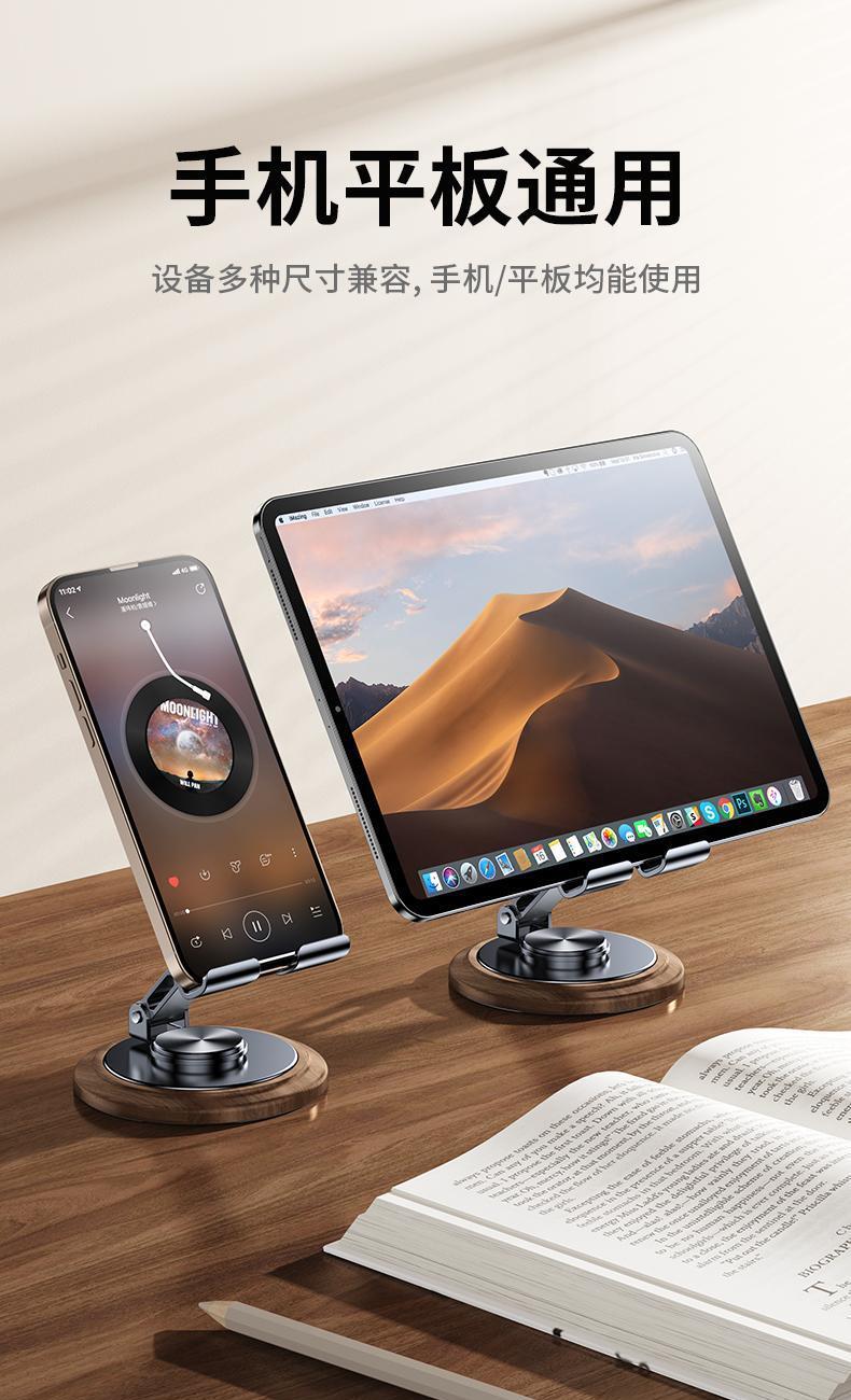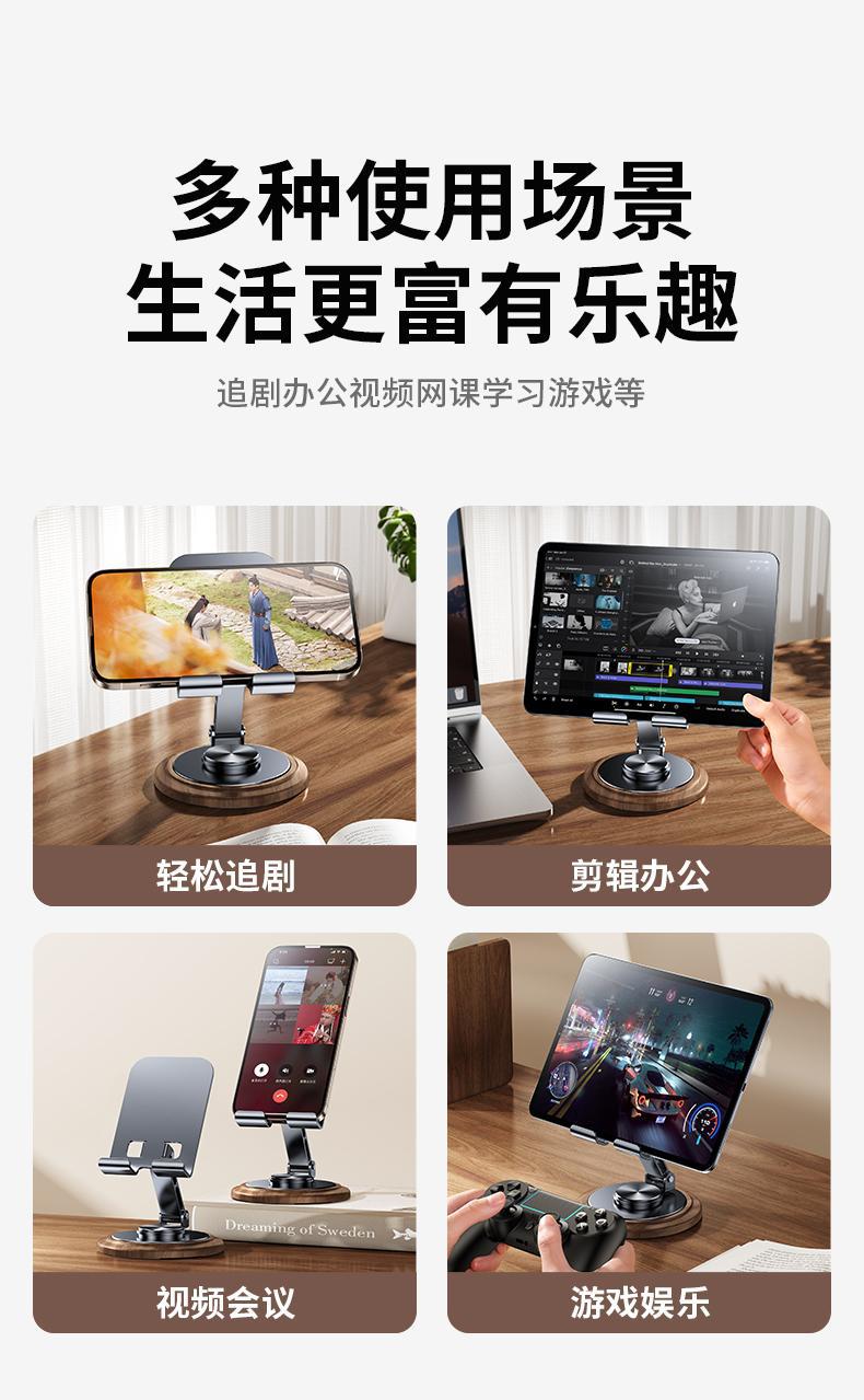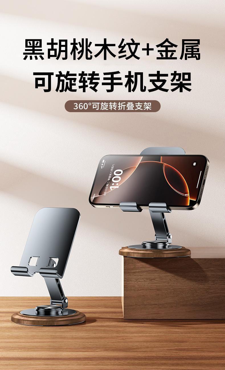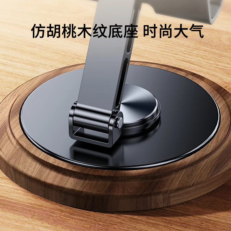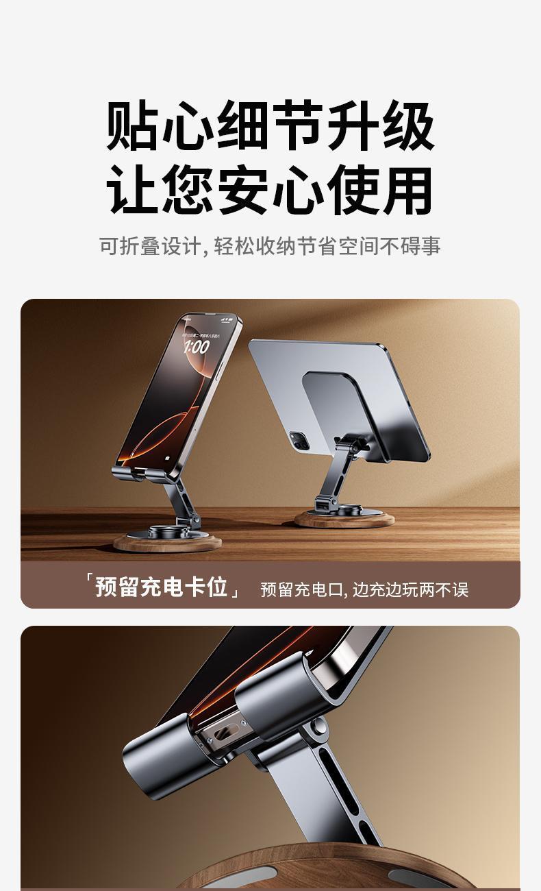 仿黑胡桃木紋,商務(wù)大氣 金屬材料支架,增加防滑腳墊 360°可旋轉(zhuǎn)底座 支撐力強(qiáng)勁,手機(jī)/平板通用 預(yù)留充電位,邊用邊充