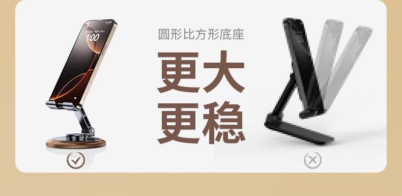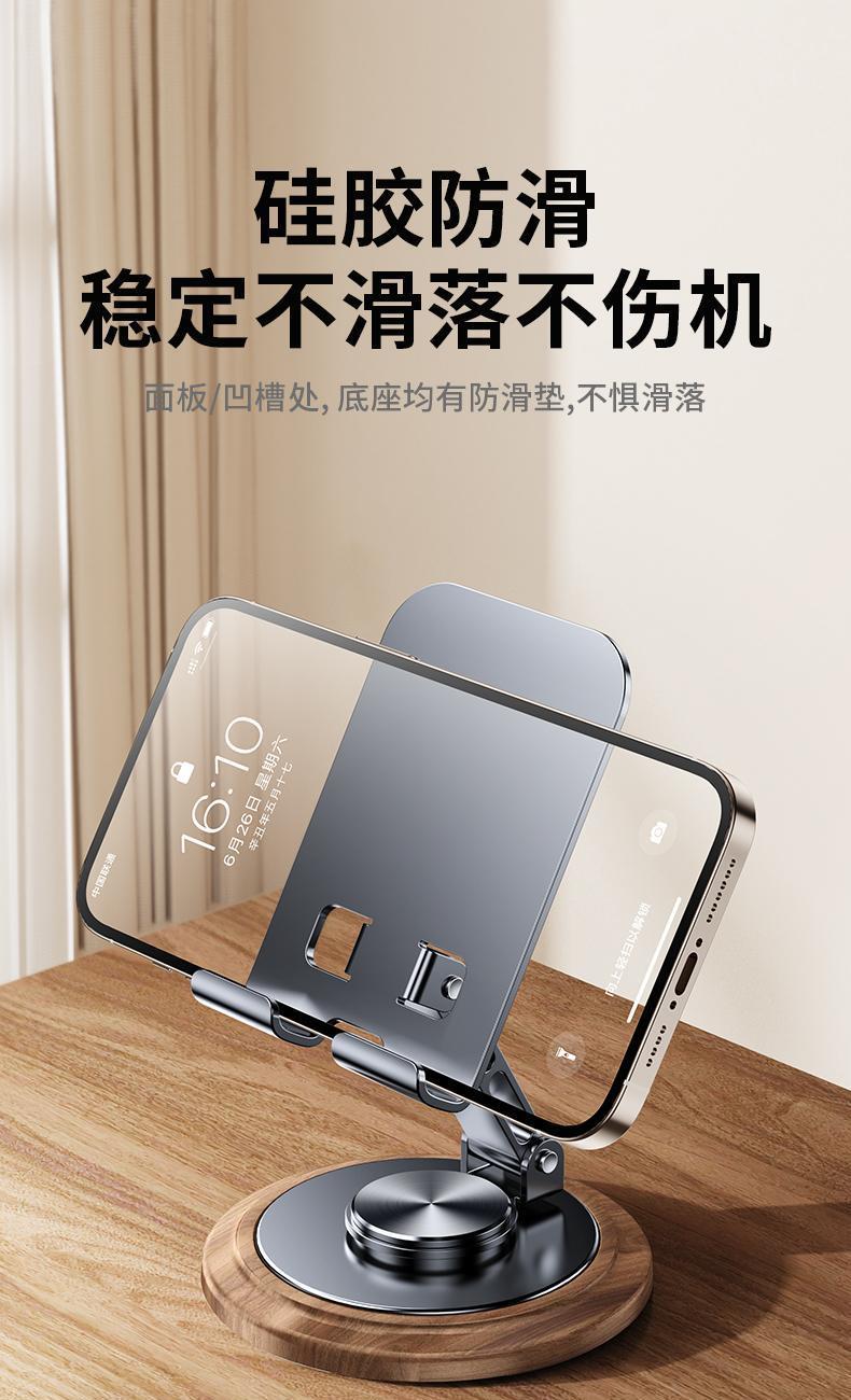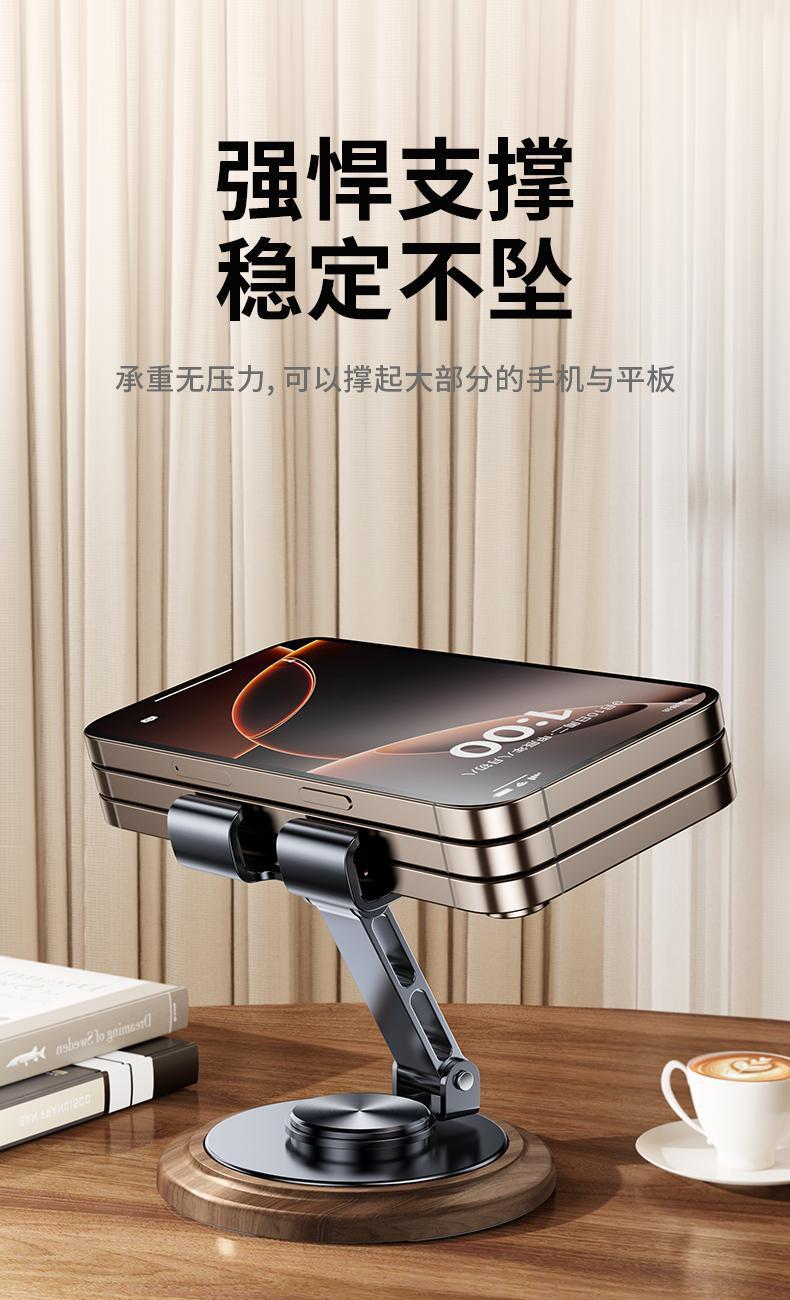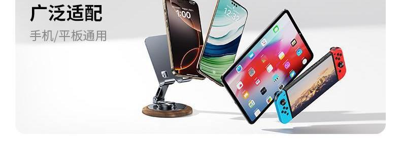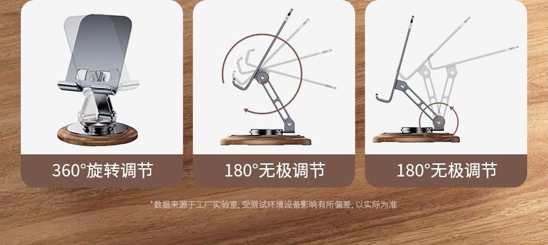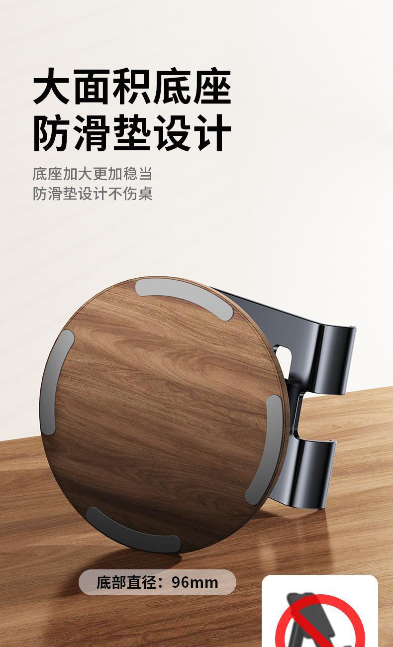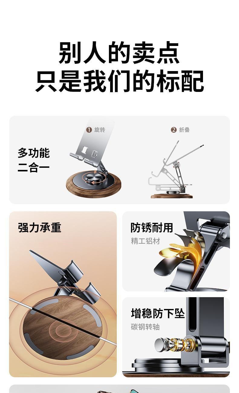 仿黑胡桃木紋,商務(wù)大氣 金屬材料支架,增加防滑腳墊 360°可旋轉(zhuǎn)底座 支撐力強(qiáng)勁,手機(jī)/平板通用 預(yù)留充電位,邊用邊充