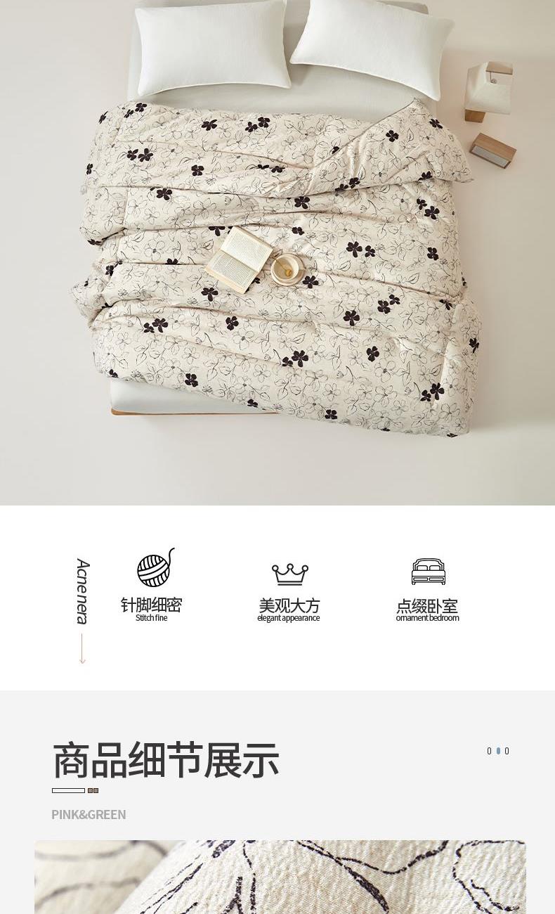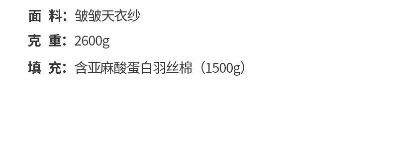 規(guī) 格:200×230(±2)cm 克 重:2600g 面 料:皺皺天衣紗 填 充:含亞麻酸蛋白羽絲棉(1500g) 皺皺天衣紗面料,細(xì)膩、柔軟,親膚,呵護(hù)健康睡眠。 含亞麻酸蛋白羽絲棉填充-植物品,健康更貼心的呵護(hù)。 高品質(zhì)、高材質(zhì)、高標(biāo)準(zhǔn),一款對(duì)生活高度負(fù)責(zé)的產(chǎn)品